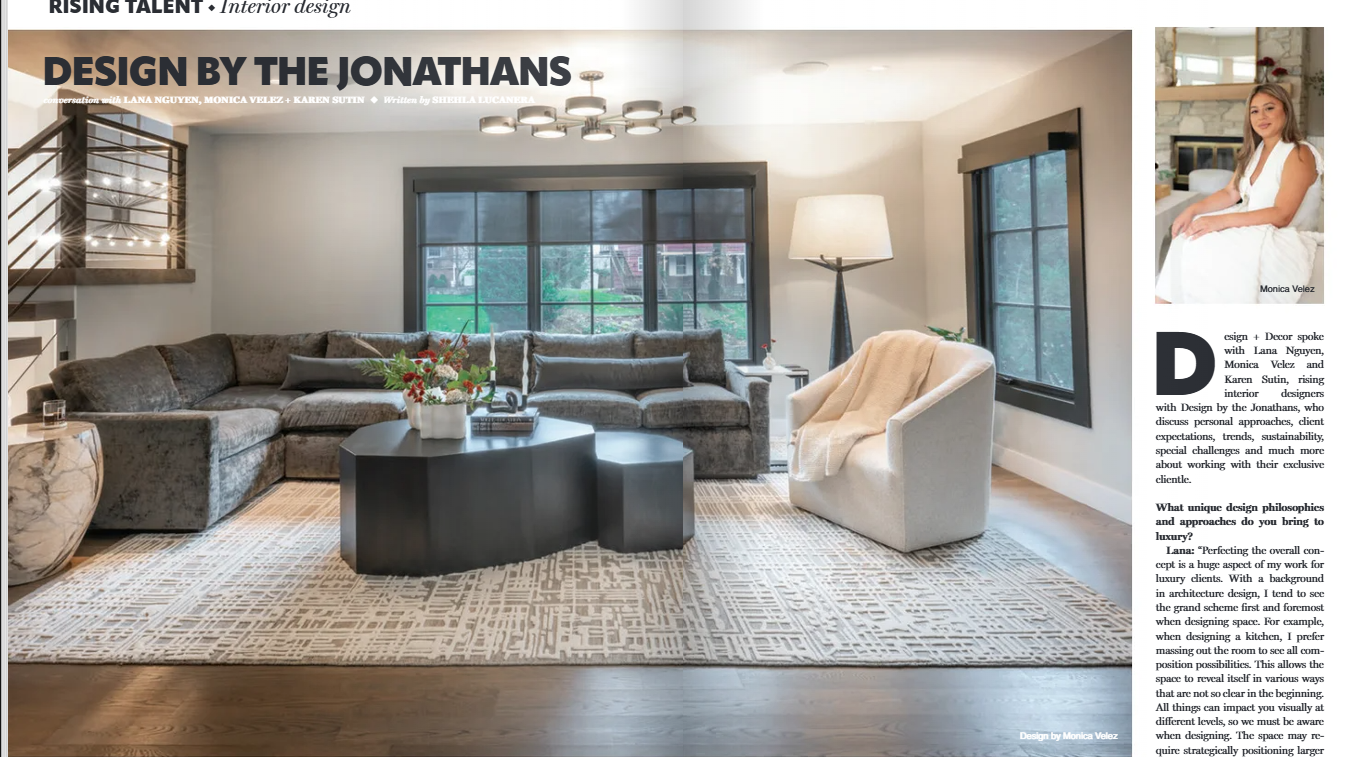 A feature article profiling rising talent at Design by the Jonathans, highlighting interior designers Lana Nguyen, Monica Velez, and Karen Sutin